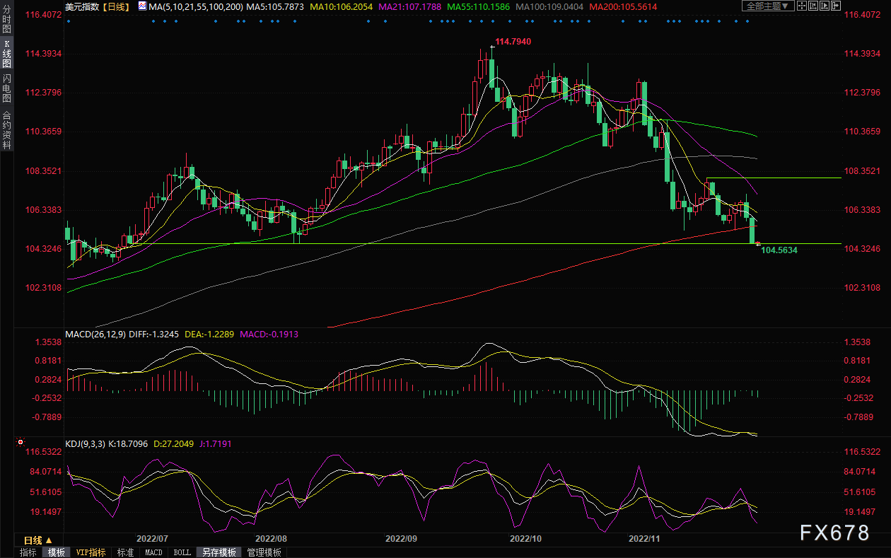 美元指数周四收跌1.22%,收报104.70,已经失守了200日均线105.56关键位置,如果不能快速回升至200日移动均线上方,这可能预示着将会进一步下跌。