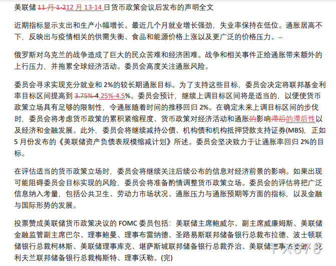 委员会寻求实现充分就业和2%的较长期通胀目标。为了支持这些目标,委员会决定将联邦基金利率目标区间提高到4.25%-4.5%。委员会预计,继续上调目标区间将是适当的,以便使货币政策立场具有足够的限制性,令通胀随着时间的推移回归2%。在确定未来上调目标区间的步伐时,委员会将考虑货币政策的累积紧缩程度、货币政策对经济活动和通胀影响的滞后性以及经济和金融发展。此外,委员会将继续减持公债、机构债和机构抵押贷款支持证券(MBS),正如5月份发布的《美联储资产负债表规模缩减计划》所述。委员会坚决致力于让通胀率回归2%的目标。