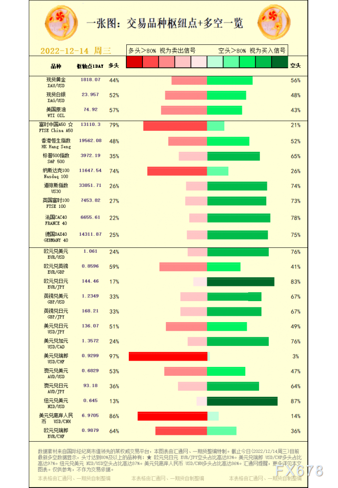 讯——一张图:交易品种枢纽点+多空占比一览。截止今日(2022/12/14周三)目前最新多空数据显示,头寸达到80%及以上的品种有:★ 欧元兑日元 EUR/JPY空头占比高达83%。美元兑瑞郎 USD/CHF多头占比高达97%。纽元兑美元 NZD/USD空头占比高达87%。美元兑离岸人民币 USD/CNH多头占比高达86%。,更多详见本文图表。仅供参考,不作为交易依据。