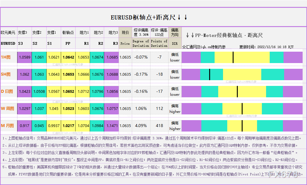 讯——图解价格偏离度:14个热门货币对枢轴点+距离尺一览。截至今日(2022/12/16周五)目前最新数据显示,14个热门货币对中:★交易品种EURUSD欧元美元,通过以上五个周期加权平均得到:综评偏离度 3.36%,通过五个周期算术平均得到综评:偏高122点。★USDJPY美元日元,综评偏离度-2.14%,偏低89点。★GBPUSD英镑美元,综评偏离度2.38%,偏高46点。★交易品种AUDUSD澳元美元,综评偏离度0.54%,偏低27点。