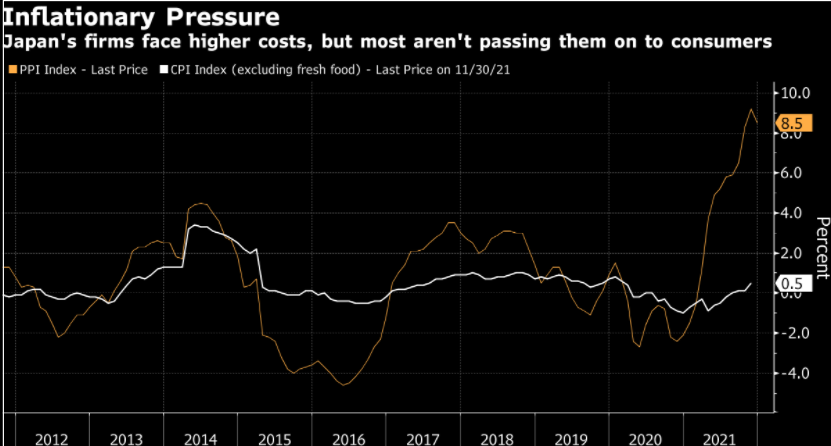 如下图所示,日本公司面临成本上升的局面,但大多数并未将其转嫁给消费者。橙色线代表日本PPI指数,白色线代表日本CPI指数