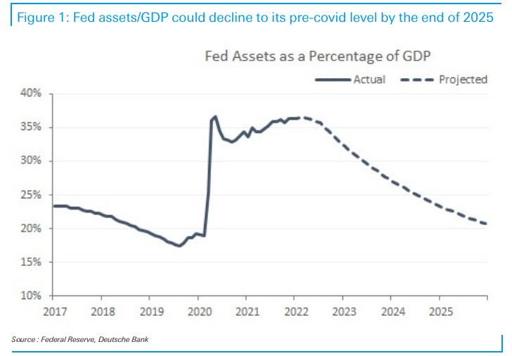 德意志银行预计,一旦QT启动,美联储的资产负债表将从目前的9万亿美元缩减到6万亿美元。
