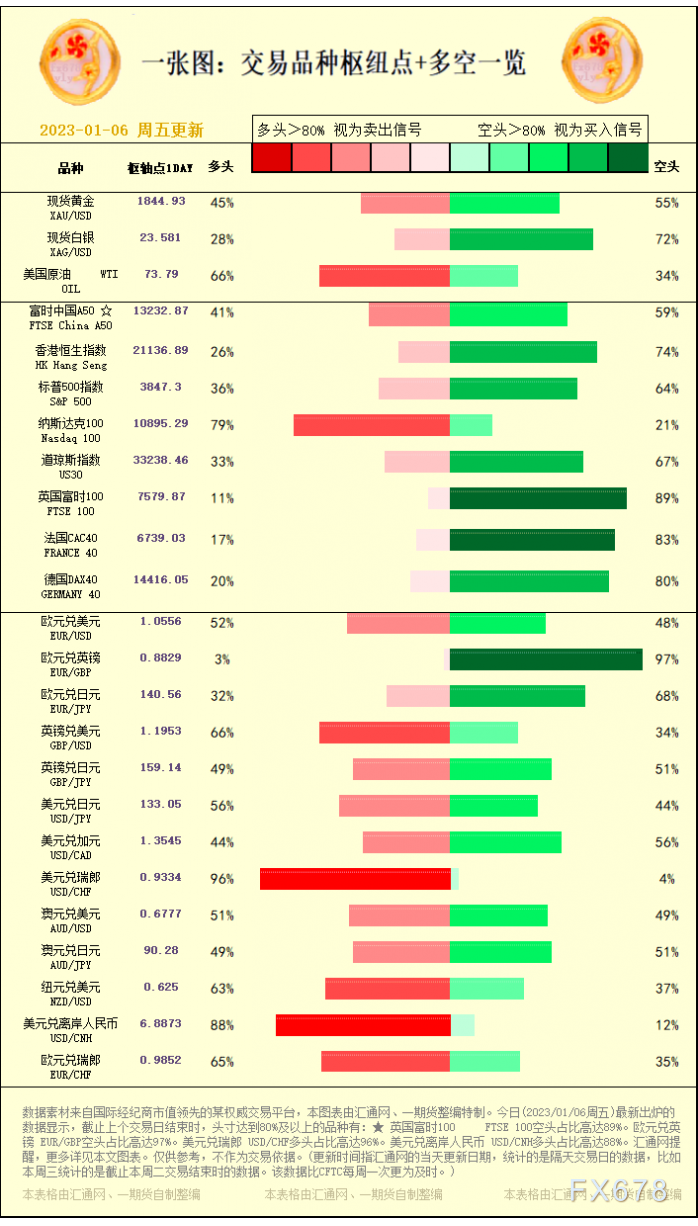 讯——一张图:交易品种枢纽点+多空占比一览。今日(2023/01/06周五)最新出炉的数据显示,截止上个交易日结束时,头寸达到80%及以上的品种有:★ 英国富时100 FTSE 100空头占比高达89%。欧元兑英镑 EUR/GBP空头占比高达97%。美元兑瑞郎 USD/CHF多头占比高达96%。美元兑离岸人民币 USD/CNH多头占比高达88%。,更多详见本文图表。仅供参考,不作为交易依据。