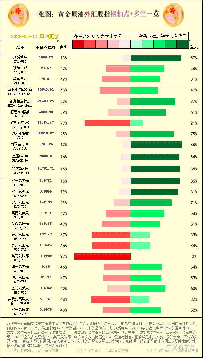 讯——一张图:黄金原油外汇股指"枢纽点+多空占比"一览。今日(2023/01/12周四)最新出炉的数据显示,截止上个交易日结束时,头寸达到80%及以上的品种有:★ 现货黄金 XAU/USD空头占比高达87%。英国富时100 FTSE 100空头占比高达88%。德国DAX40 GERMANY 40空头占比高达85%。欧元兑美元 EUR/USD空头占比高达85%。欧元兑英镑 EUR/GBP空头占比高达81%。美元兑瑞郎 USD/CHF多头占比高达97%。,更多详见本文图表。仅供参考,不作为交易依据。