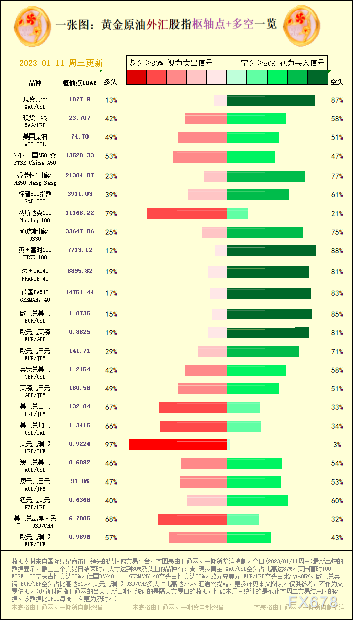 讯——一张图:黄金原油外汇股指"枢纽点+多空占比"一览。今日(2023/01/11周三)最新出炉的数据显示,截止上个交易日结束时,头寸达到80%及以上的品种有:★ 现货黄金 XAU/USD空头占比高达87%。英国富时100 FTSE 100空头占比高达88%。德国DAX40 GERMANY 40空头占比高达83%。欧元兑美元 EUR/USD空头占比高达85%。欧元兑英镑 EUR/GBP空头占比高达81%。美元兑瑞郎 USD/CHF多头占比高达97%。,更多详见本文图表。仅供参考,不作为交易依据。