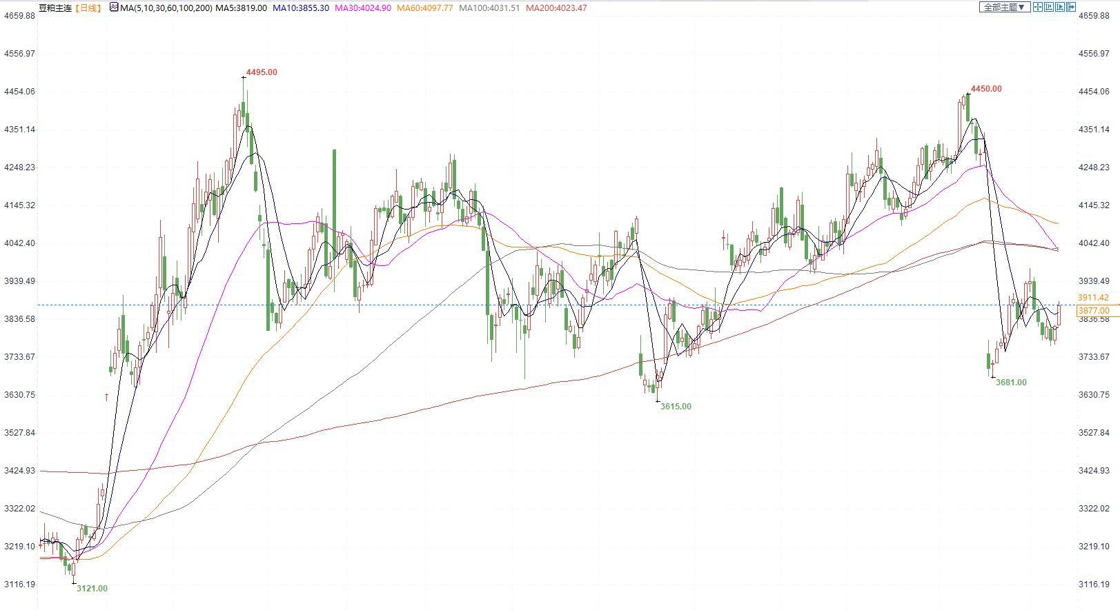 豆粕2305合约日内涨2.13%,收盘价3877元/吨,现货张家港43%蛋白豆粕4560元/吨