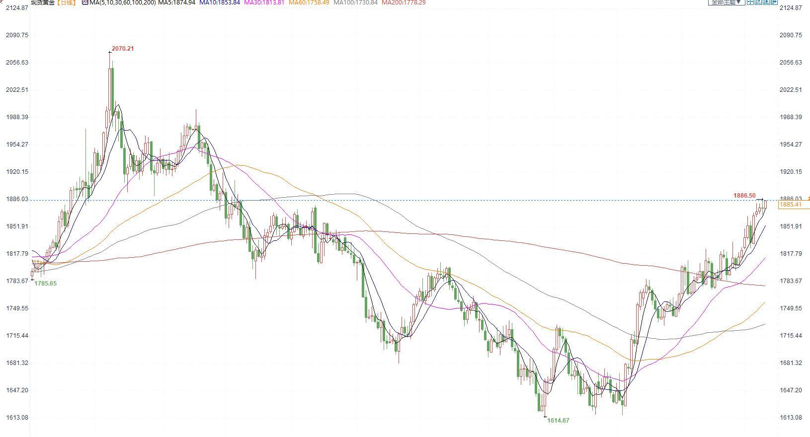 【今日行情】金银涨跌互现。AU2304收盘价为414.58,收涨0.06%;AG2306收盘价为5215,收跌0.32%。美元指数在103附近窄幅震荡,十年期美债收益率跌至3.5%附近,中期两大指数预计均将弱势运行,对金银以支撑为主。