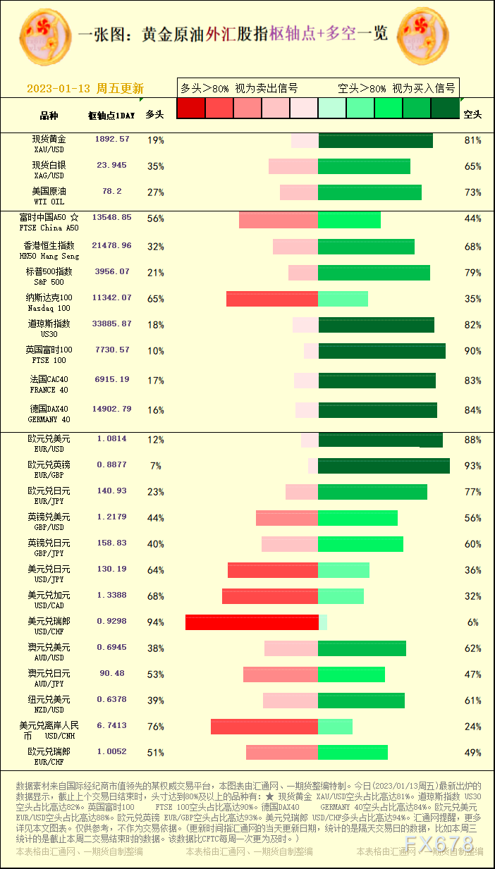讯——一张图:黄金原油外汇股指"枢纽点+多空占比"一览。今日(2023/01/13周五)最新出炉的数据显示,截止上个交易日结束时,头寸达到80%及以上的品种有:★ 现货黄金 XAU/USD空头占比高达81%。道琼斯指数 US30空头占比高达82%。英国富时100 FTSE 100空头占比高达90%。德国DAX40 GERMANY 40空头占比高达84%。欧元兑美元 EUR/USD空头占比高达88%。欧元兑英镑 EUR/GBP空头占比高达93%。美元兑瑞郎 USD/CHF多头占比高达94%。,更多详见本文图表。仅供参考,不作为交易依据。