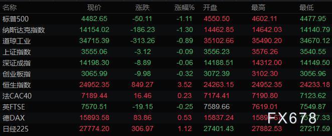 美股收盘情况:标普500指数下跌1.1%,报4482.73点;道琼斯工业平均指数下跌0.9%,报34715.39点;纳斯达克综合指数下跌1.3%,报14154.02点;纳斯达克100指数下跌1.3%,报14846.46点;罗素2000指数下跌1.9%,报2024.037点。