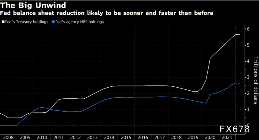 彭博首席美国经济学家Anna Wong说:“到年中,我们预计FOMC将认识到,要将最终实现2%通膨目标的可能性最大化,他们还有更多事情要做。因此,委员会今年可能加息5次。我们目前预计缩表将在2022年第三季度开始,围绕这一时机存在很大的不确定性。