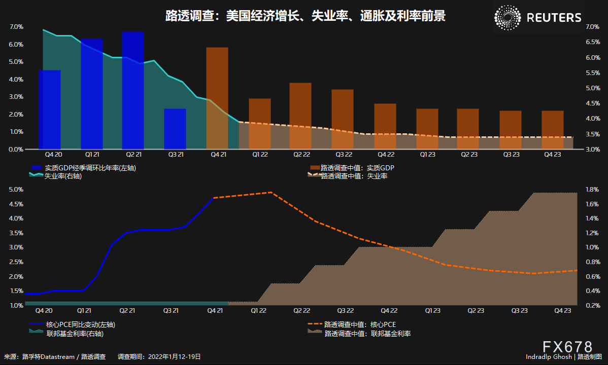 1月12-19日路透调查的预测中值显示,美联储今年将从3月开始加息三次,到2022年底指标利率将升至0.75-1.00%,12月调查时预测为加息两次。