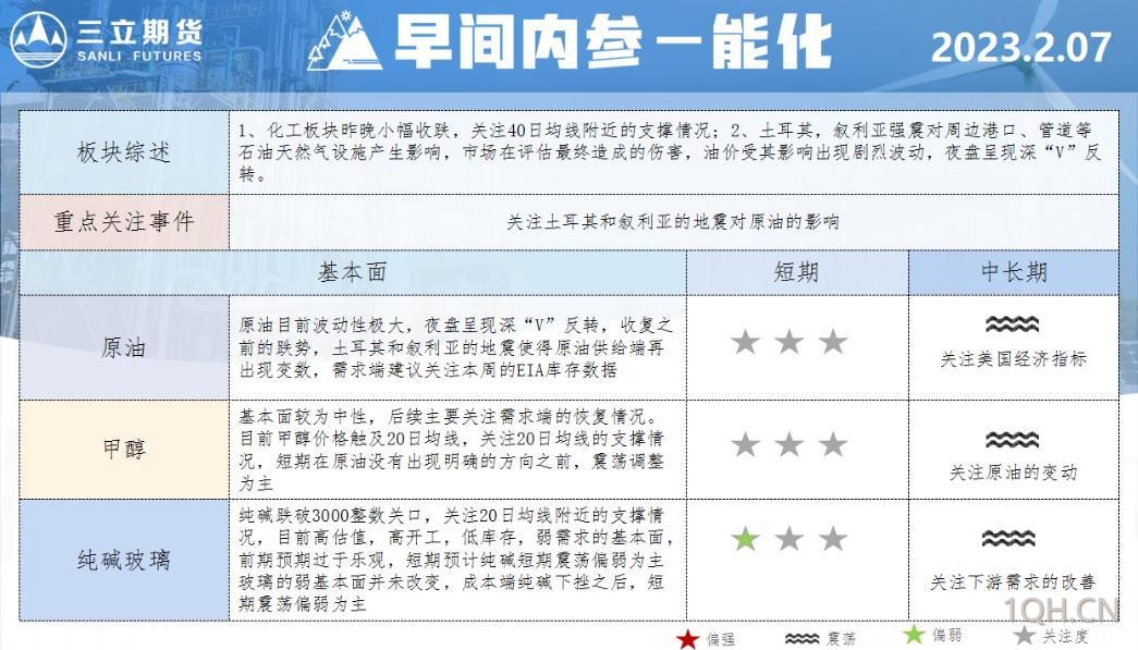 讯——三立期货早间内参显示,原油短线偏向震多头,中长线偏向震荡,关注需求端恢复情况。甲醇短线偏向空头,中长线偏向震荡,关注成本端的变动;纯碱玻璃短线偏向空头,中长线偏向震荡,关注地产需求的改善。
