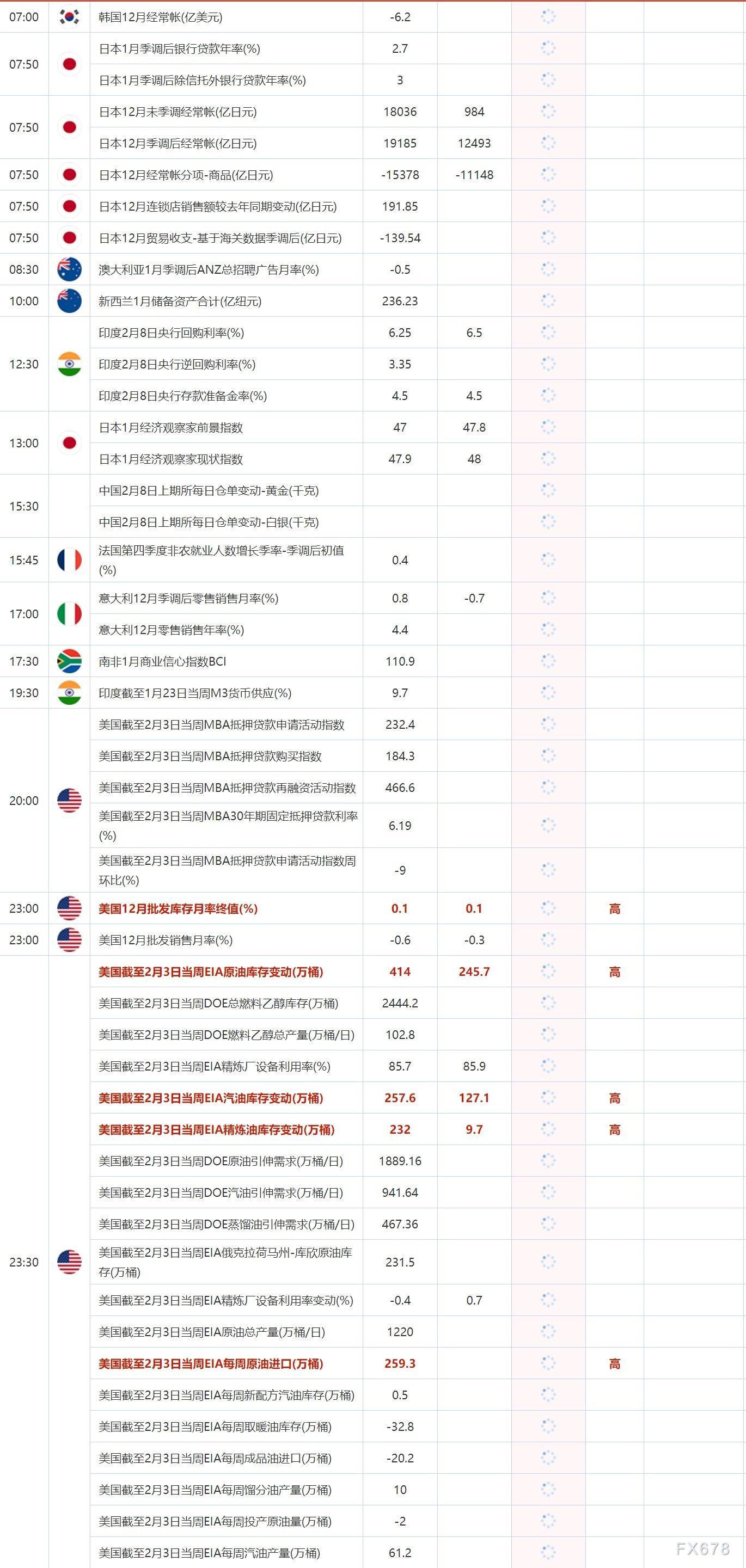讯——2月8日,投资者需要关注的重点数据:韩国12月经常帐,美国12月批发库存月率终值,美国12月批发销售月率,美国截至2月3日当周EIA原油库存变动,美国截至2月3日当周EIA汽油库存变动,美国截至2月3日当周EIA精炼油库存变动,美国截至2月3日当周EIA每周原油进口。需要关注的大事件包括纽约联储主席威廉姆斯接受《华尔街日报》的采访;美联储理事丽莎·库克出席一场讨论会;欧洲央行管委诺特发表讲话。