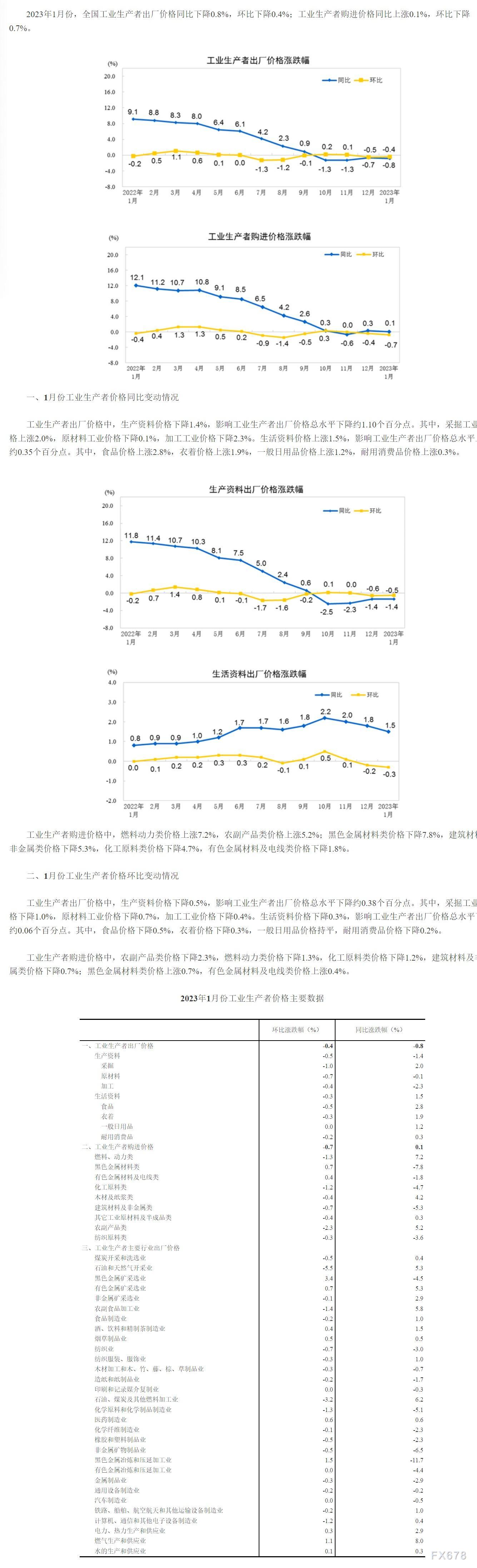 据测算,在1月份0.8%的PPI同比降幅中,去年价格变动的翘尾影响约为-0.4个百分点,新涨价影响约为-0.4个百分点。