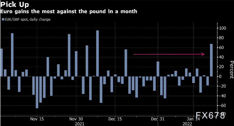 交易员此前将英镑兑欧元推高,因预期英国央行最早将在下个月再次升息,以应对通胀急升。欧元兑英镑一度创2020年2月以来新低至0.8307,但周五欧元兑英镑大幅反弹,录得近一个月最大单日涨幅。