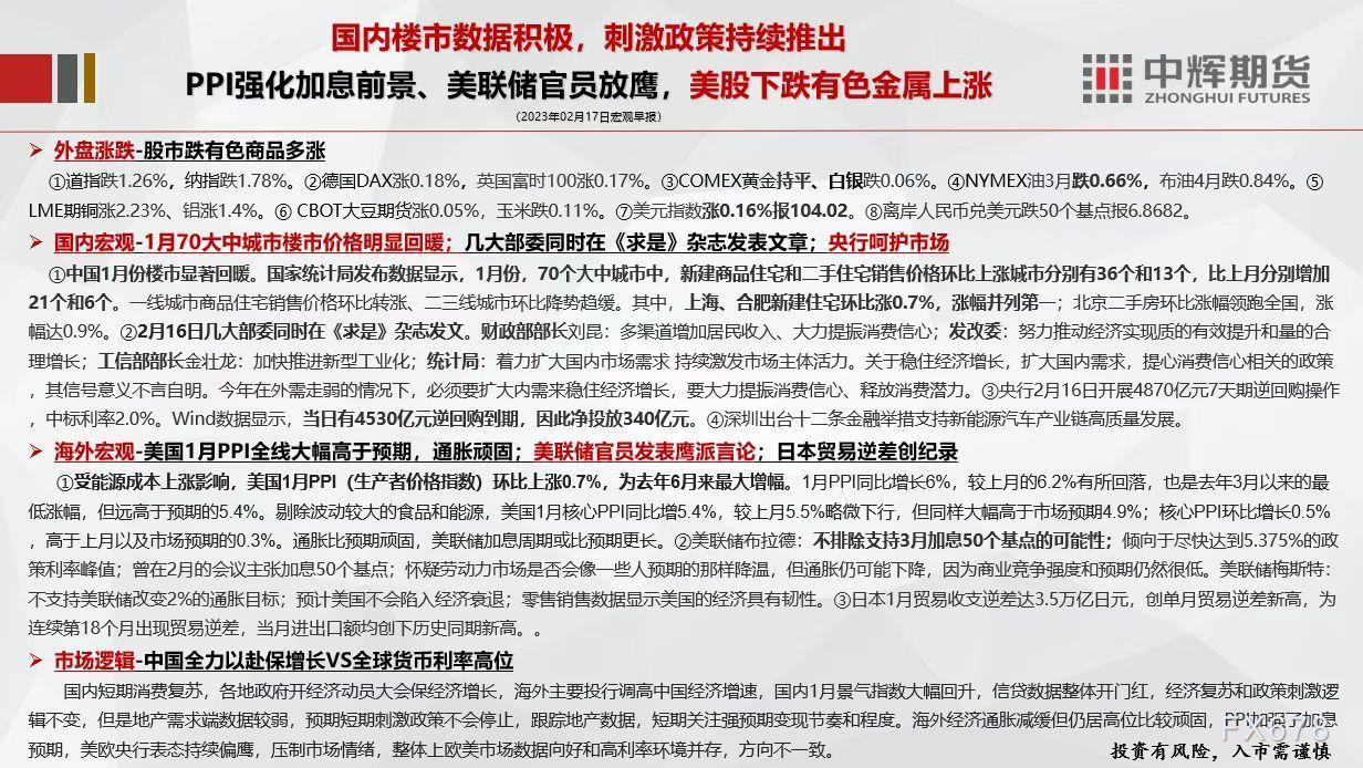 讯——2月17日,中辉期货发布宏观早报,称美欧央行表态持续偏鹰,压制市场情绪,整体上欧美市场数据向好和高利率环境并存,方向不一致。