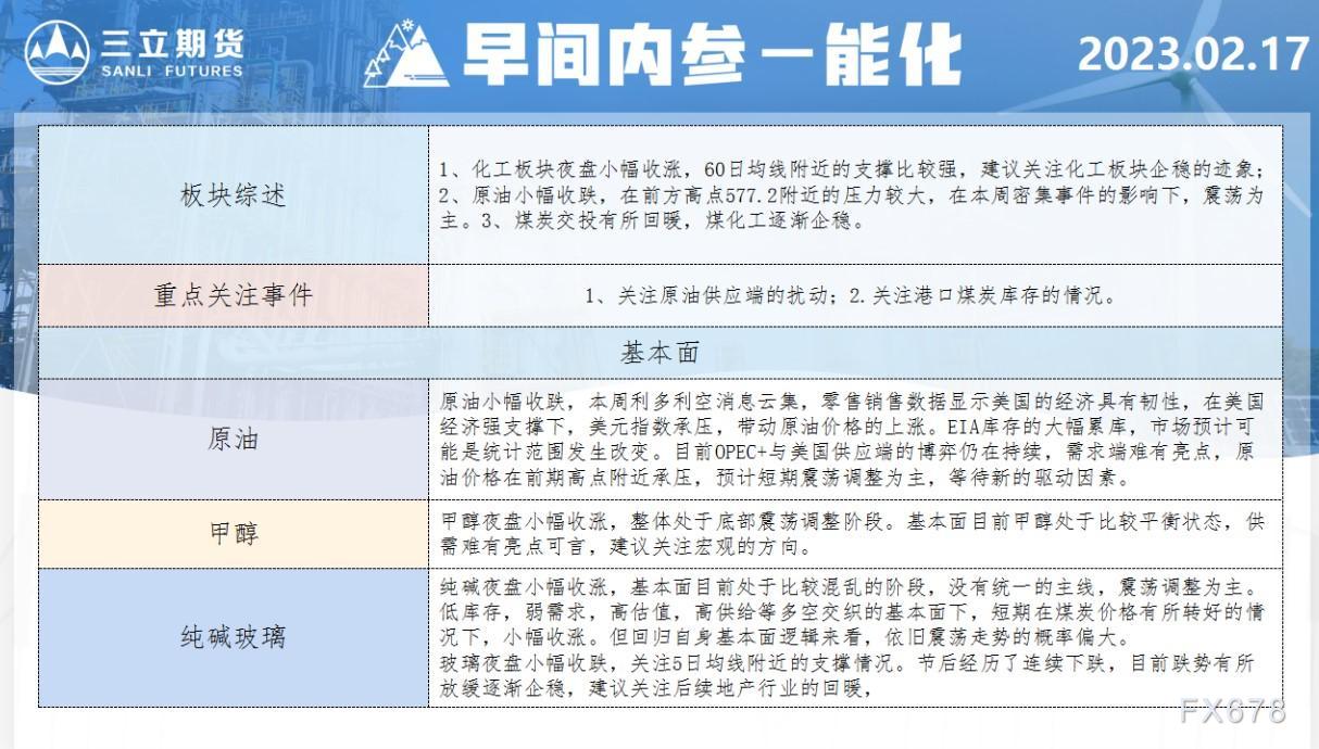 讯——三立期货早间内参显示,原油短期预计以震荡为主,甲醇整体处于底部震荡调整状态,玻璃依旧震荡走势的概率较大。