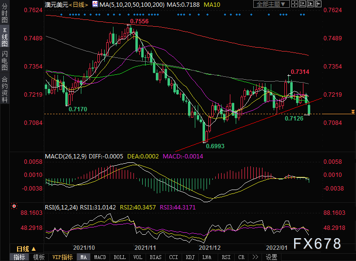 周一(1月24日)澳元兑美元在欧洲时段持续下跌,最低跌至一个月低点0.7125,因日内市场避险情绪再度升温。