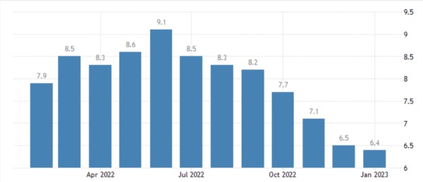 2月15日,美国劳工统计局公布2023年1月的消费者物价指数(CPI)数据。实际结果好于预期,通胀率同比上升6.4%,高于预期的6.2%。