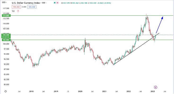 从美元指数周线图来看,美元指数突破了上升的阻力趋势线。此外,美元指数从支撑位102.00(2008年和2020年的高点)大幅逆转。因此,综合这些因素,美元仍处于强劲的上升趋势,此前的下跌只是大规模反弹前的调整。