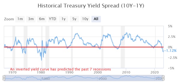 正如你在上图中所看到的,图表中的灰色条形图显示美国自1967年以来的经济衰退。从该图可以看出,从历史上看,一旦收益率差降至0%以下(红色y轴),经济衰退通常会随之而来。在20世纪后期的经济衰退中尤其如此。1980年4月左右,在20世纪80年代初的经济衰退期间,收益率差达到-3.16%的历史低点。