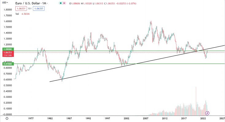 2022年,欧元/美元跌破始于1985年3月的支撑趋势线。最近,欧元/美元跌破1.1000。值得注意的是,欧元/美元自2008年以来一直处于强劲下行趋势。我们预计这一趋势将继续,欧元/美元将跌向2000年低点0.8500。