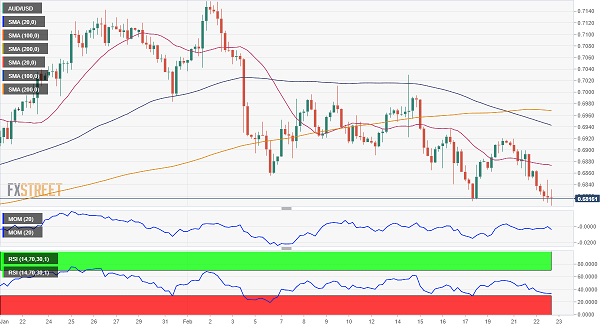 4小时走势图描绘了一个看跌的近期图景。澳元/美元远低于其主要移动均线,20周期SMA在0.6870附近无方向,但100周期SMA在20周期SMA上方维持向下倾斜。技术指标保持在负值区域,动量向下,RSI在34附近盘整,反映出缺乏买盘兴趣。