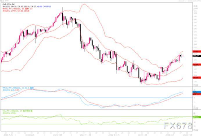 周二(2月28日)稍早,美元兑日元一度触及136.93的逾两个月高位,然后在美国数据公布后逆转了涨势。美元兑日元纽约尾盘下跌0.06%,报136.22,盘中最低曾下落至135.73。日本压低收益率的政策意味着日元对其他地方的收益率走势很敏感,不过即将上任的日本央行总裁植田和男本周表示,现在就央行可能如何调整政策发表评论还为时过早。周二他同样淡化了立即全面改革超宽松货币政策的可能性。接下来,市场关注的焦点将会放在3月份美国的就业和消费价格指数,以寻找美联储未来货币政策的方向。而美元利率的继续提升,无疑对于日元来说将是压力巨大的。短线4小时图上,美元兑日元存在超买调整的欲求,但预计调整幅度有限,且调整价位若紧守134-135区域之上,后市仍有机会攀高。进阶段对于美元兑日元的走势以防其走升的风险为主。日元逆转走强的要素尚不具备。
