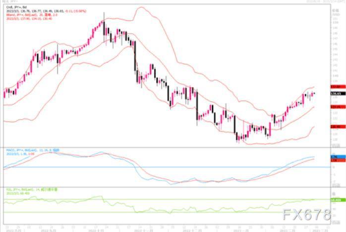 周四(3月1日)美元兑日元上涨0.42%,收盘于136.77,盘中一度穿破137。周四当天美国劳工部表示,在截至2月25日的一周内,初次失业金人数减少2,000人,经季节性调整后为19万人。这是初请失业金人数连续第七周保持在20万人以下。劳工部的第二份报告显示,单位劳工成本--即每单位产出所需的劳动力价格--在第四季环比年率攀升3.2%。2月报告的前值为上涨1.1%。劳动力成本在第三季攀升6.9%,此前两个季度也均大幅上涨。数据表明,美国的核心通胀问题比以前想象的要严重,对利率预期敏感的两年期美债收益率盘中触及2007年7月以来最高。利率期货稍早的定价显示,市场预计到9月联邦基金利率将攀升至5.493%的峰值。这也预示着市场认为美联储将进一步加息以抑制不断上涨的消费价格。反观日本方面,日央行仍不愿改变其鸽派立场,日本债券收益率仍然低迷。两国央行的举措,使得美元的前景看起来在短期内比日元更具建设性。如果22年10月-2023年1月修正的38.2%斐波那契回档位137.20破位,则美元多头极有可能将美元兑日元推向138-140这些心里区域。而目前日元若要回强,除非日本央行在货币政策上有动作。