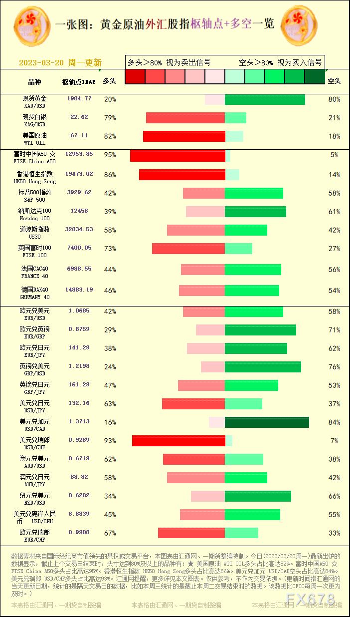 讯——一张图:黄金原油外汇股指"枢纽点+多空占比"一览。今日(2023/03/20周一)最新出炉的数据显示,截止上个交易日结束时,头寸达到80%及以上的品种有:★ 美国原油 WTI OIL多头占比高达82%。富时中国A50 ☆FTSE China A50多头占比高达95%。香港恒生指数 HK50 Hang Seng多头占比高达86%。美元兑加元 USD/CAD空头占比高达84%。美元兑瑞郎 USD/CHF多头占比高达93%。,更多详见本文图表。仅供参考,不作为交易依据。
