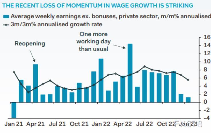 针对周四的利率决议,英国国家统计局上周二公布的数据显示,如果不考虑可自由支配的奖金,1月份的年度薪酬增幅将从6.7%降至6.5%;如果将奖金纳入衡量标准,薪酬增幅将从6%降至5.7%。