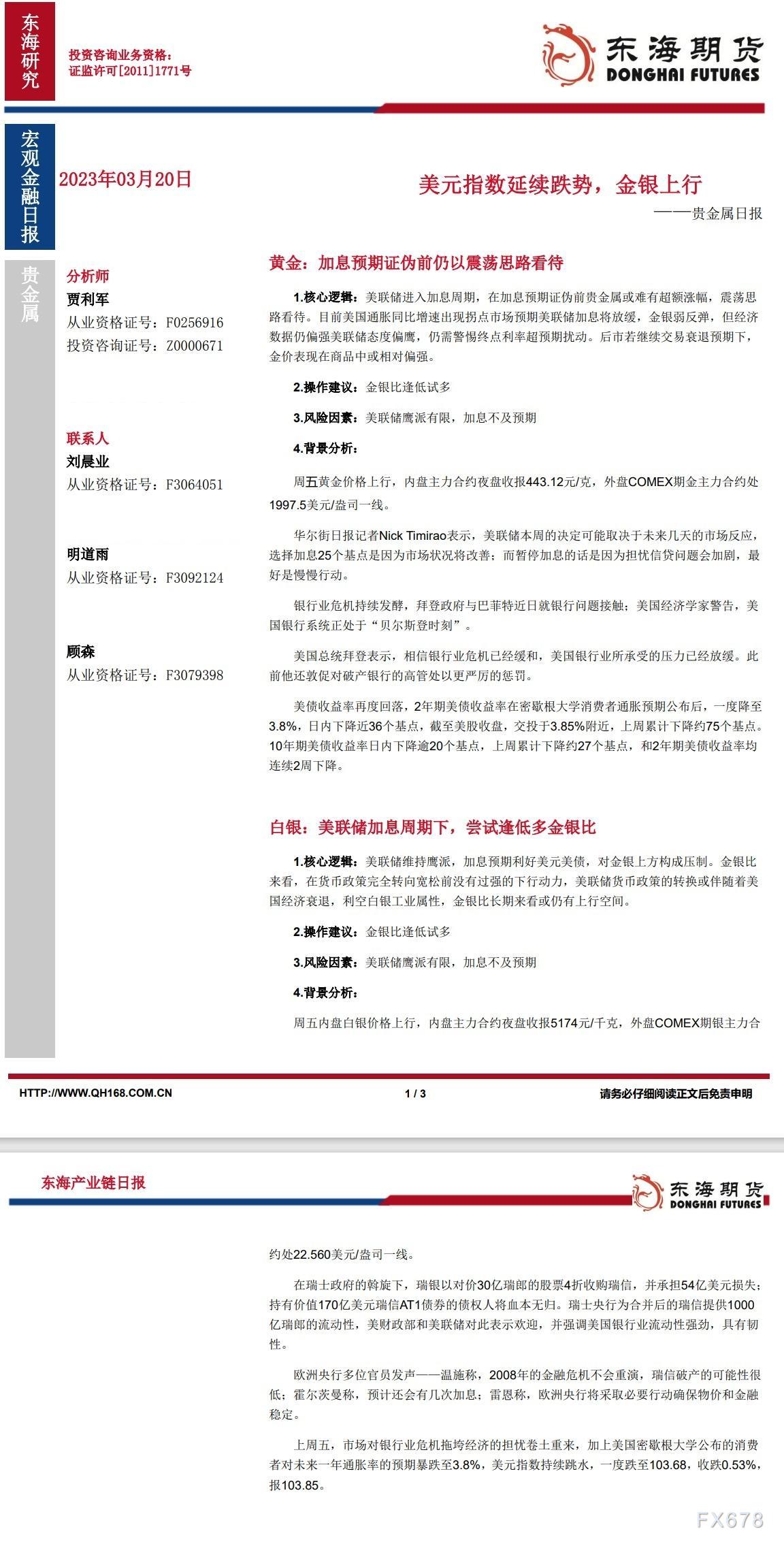 【东海期货3月20日产业链日报】贵金属篇:美元指数延续跌势,金银上行