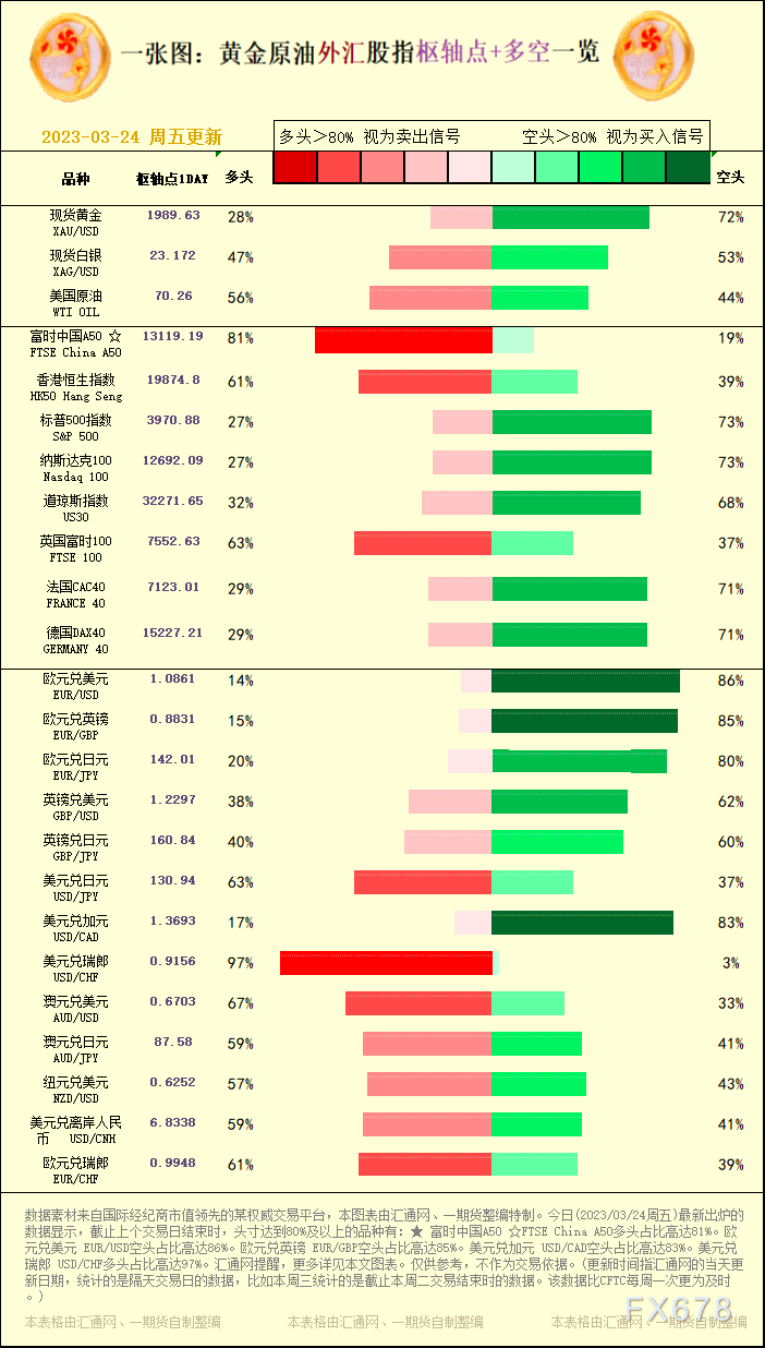 讯——一张图:黄金原油外汇股指"枢纽点+多空占比"一览。今日(2023/03/24周五)最新出炉的数据显示,截止上个交易日结束时,头寸达到80%及以上的品种有:★ 富时中国A50 ☆FTSE China A50多头占比高达81%。欧元兑美元 EUR/USD空头占比高达86%。欧元兑英镑 EUR/GBP空头占比高达85%。美元兑加元 USD/CAD空头占比高达83%。美元兑瑞郎 USD/CHF多头占比高达97%。,更多详见本文图表。仅供参考,不作为交易依据。
