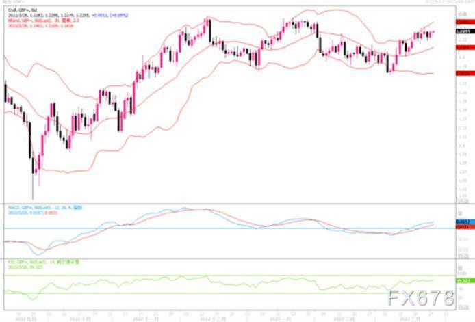 周一(3月27日)英镑上涨0.45%,报1.2283。英国央行总裁贝利周一表示,利率制定者将专注于对抗通胀,不会被对全球银行系统健康状况的担忧所过度影响。而于此同时市场认为,美联储在5月份的下一次会议上维持利率不变的可能性约为55%,并预计最早在7月份就会降息。美联储加息进入尾声的市场预期氛围渐渐变浓,无疑将间接给到英镑以提振。日线图上,英镑兑美元继续保持在各短期均线上方,各类技术指标业平缓地向上延展,显示英镑多头方保持着韧性。若上方近期的阻力水平1.23被冲穿,上方目标瞄向1.2448(1月23日高点),进一步冲击的目标将会是1.25-1.26区域。4小时图上,似形成双底之态,近期在1.2180-1.2200价格区域的支撑性较强,MACD有形成金叉迹象。整体看镑美处在继续反弹走高的态势中。
