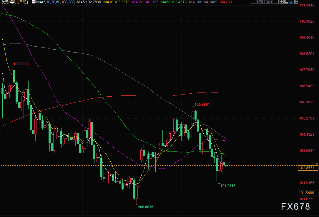 衡量美元兑六个竞争对手货币的美元指数当日下跌0.087%,报102.9,离上周四触及的101.91的近七周低点不远。