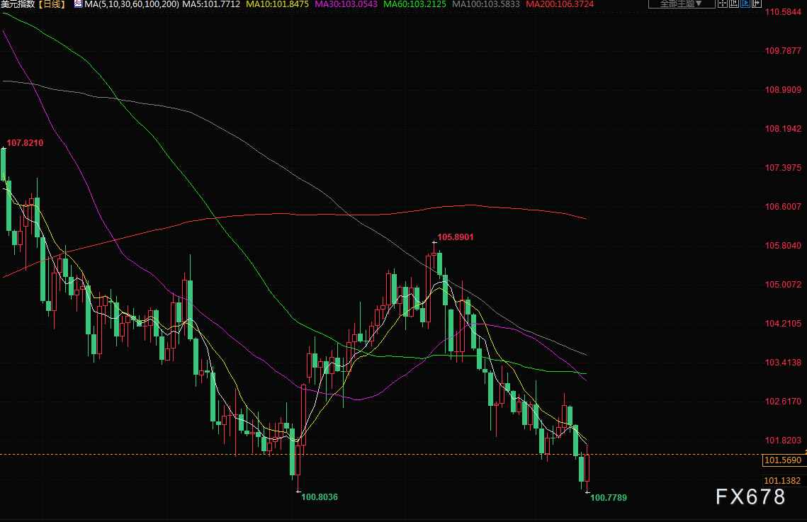 美元指数当日上涨0.57%,报101.53,此前跌至100.78,为去年4月以来最低。它仍处于连续第五周周线下跌的轨道上。