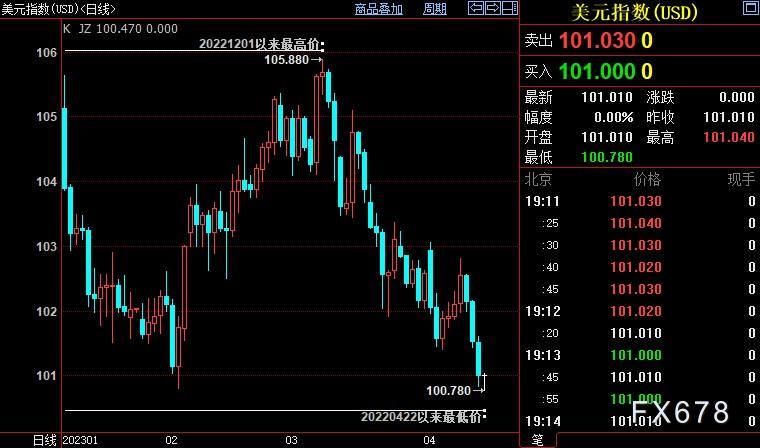 讯——美元指数连续第四周下跌,刷新2022年4月下旬以来低点至100.779,并有望创下1月13日当周以来最大跌幅(逾1%),因迹象显示美国通胀可能降温之后,交易员加大对美联储加息周期即将结束的预期。