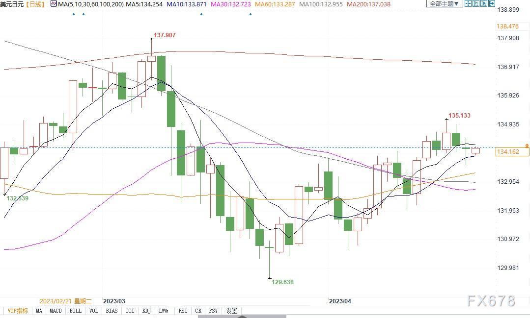 北京时间4月24日10:23,美元兑日元报134.17/18