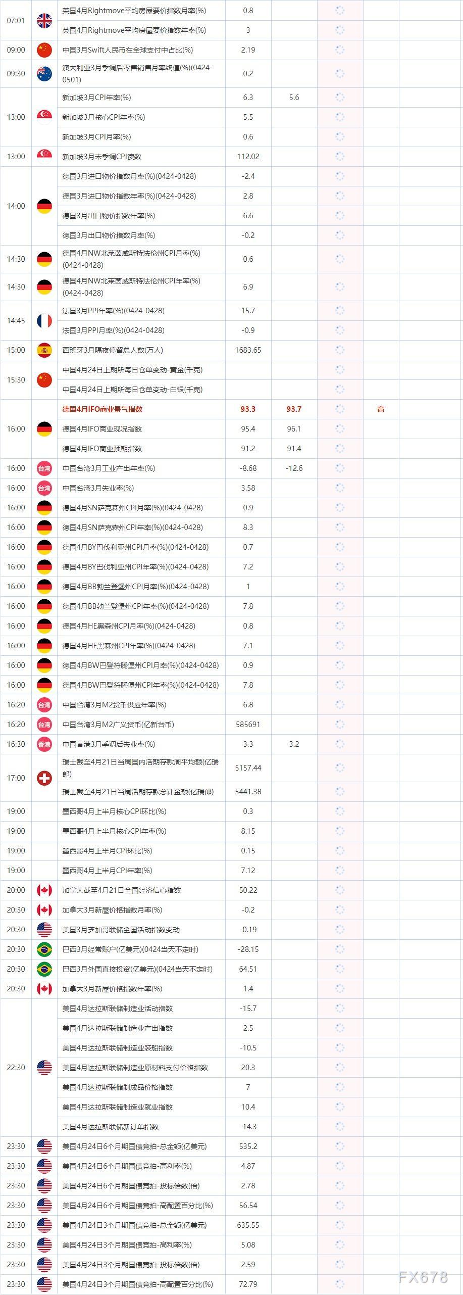 讯——4月24日,投资者需要关注的重点数据:新加坡3月CPI年率,德国4月IFO商业景气指数,加拿大截至4月21日全国经济信心指数,加拿大3月新屋价格指数月率,加拿大3月新屋价格指数年率,美国4月达拉斯联储制造业活动指数。需要关注的大事件包括欧洲央行管委维勒鲁瓦发表讲话,欧洲央行执委帕内塔发表讲话。