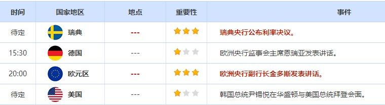 讯——4月26日,投资者需要关注的重点数据:澳大利亚第一季度CPI季率,澳大利亚第一季度CPI年率,德国5月Gfk消费者信心指数,英国4月CBI零售销售差值,美国3月批发库存月率初值,美国3月耐用品订单月率初值,美国截至4月21日当周EIA原油库存变动。需要关注的大事件包括瑞典央行公布利率决议,欧洲央行副行长金多斯发表讲话。