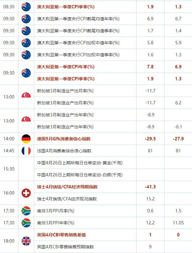09:30 澳大利亚第一季度CPI年率(%) , 前值 7.8 , 预期值 6.9 , 公布值:待发布