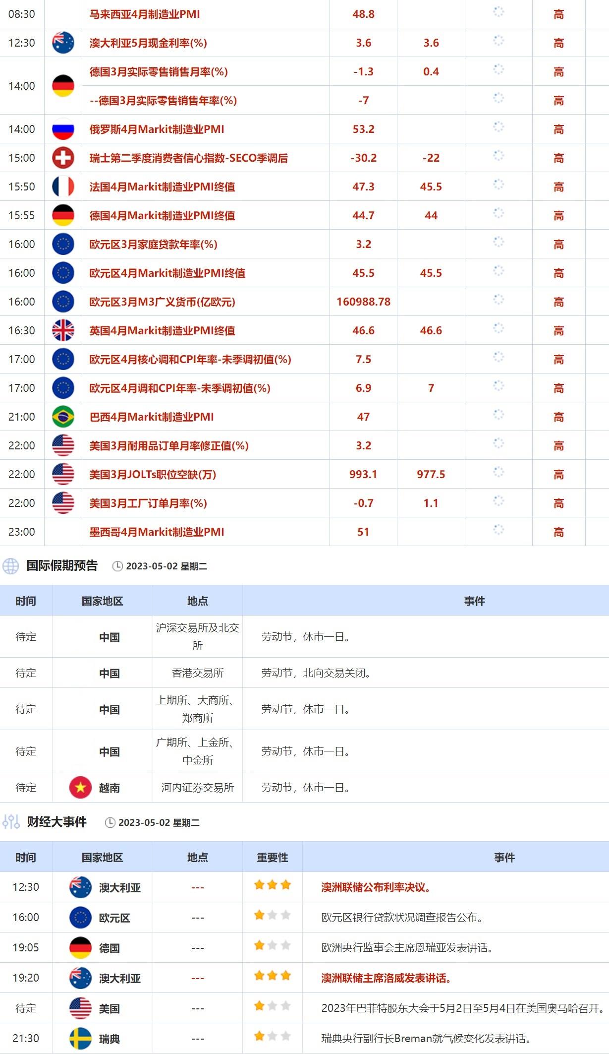 讯——5月2日,投资者需要关注的重点数据:德国3月实际零售销售月率,德国3月实际零售销售年率,法国、德国、英国和欧元区4月Markit制造业PMI终值,欧元区4月CPI,美国3月工厂订单月率,美国3月耐用品订单月率修正值。需要关注的大事件包括澳洲联储利率决议,澳洲联储主席洛威发表讲话;中国和越南各交易所的劳动节假期休市公告。