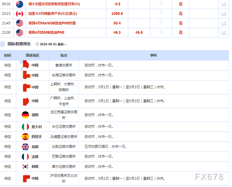讯——北京时间周一(5月1日),本周聚焦美联储利率决议,欧洲央行公布利率决议以及澳洲联储利率决议;此外,关注美国非农数据以及地缘局势进展,诸多重要因素影响下,本周市场波动或加大,需谨慎。