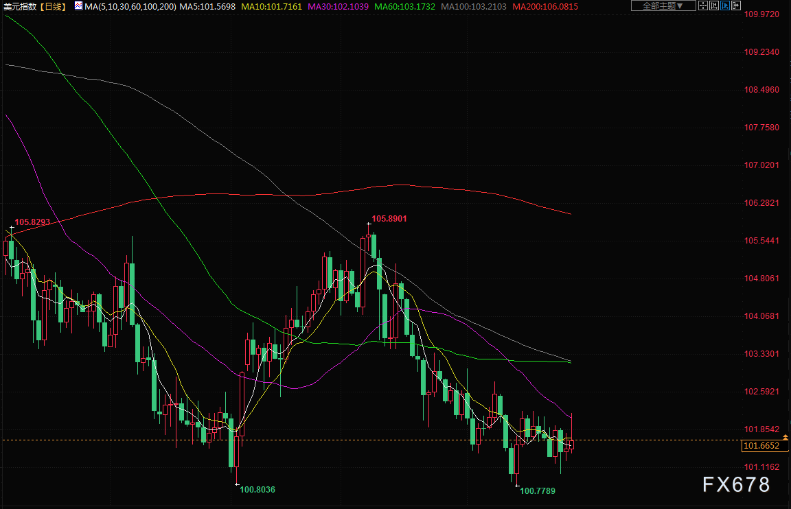 衡量美元兑六种主要货币价值的美元指数上涨0.2%,至101.65。