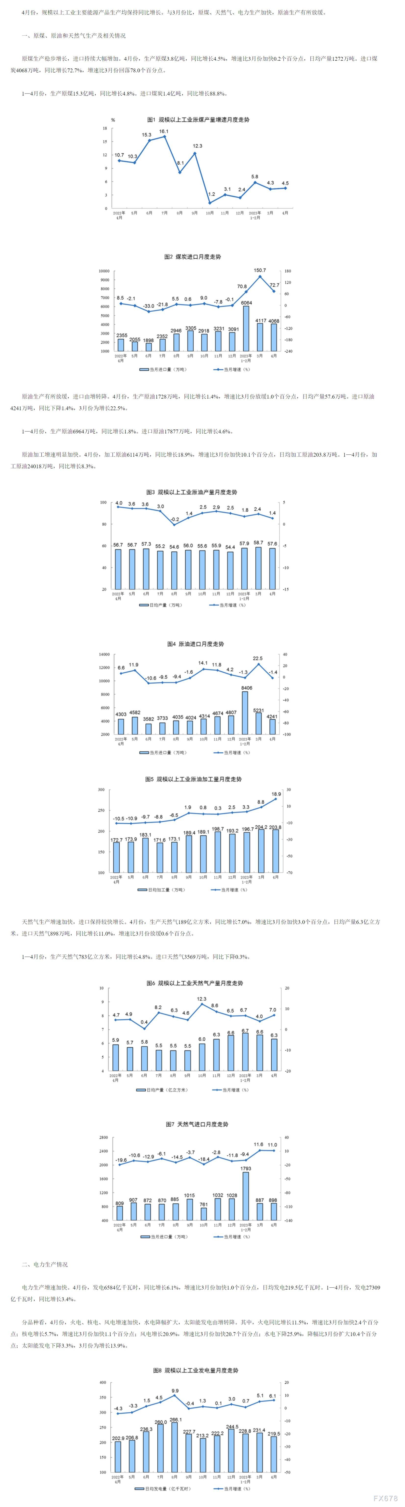 原煤生产稳步增长,进口持续大幅增加。4月份,生产原煤3.8亿吨,同比增长4.5%,增速比3月份加快0.2个百分点,日均产量1272万吨。进口煤炭4068万吨,同比增长72.7%,增速比3月份回落78.0个百分点。