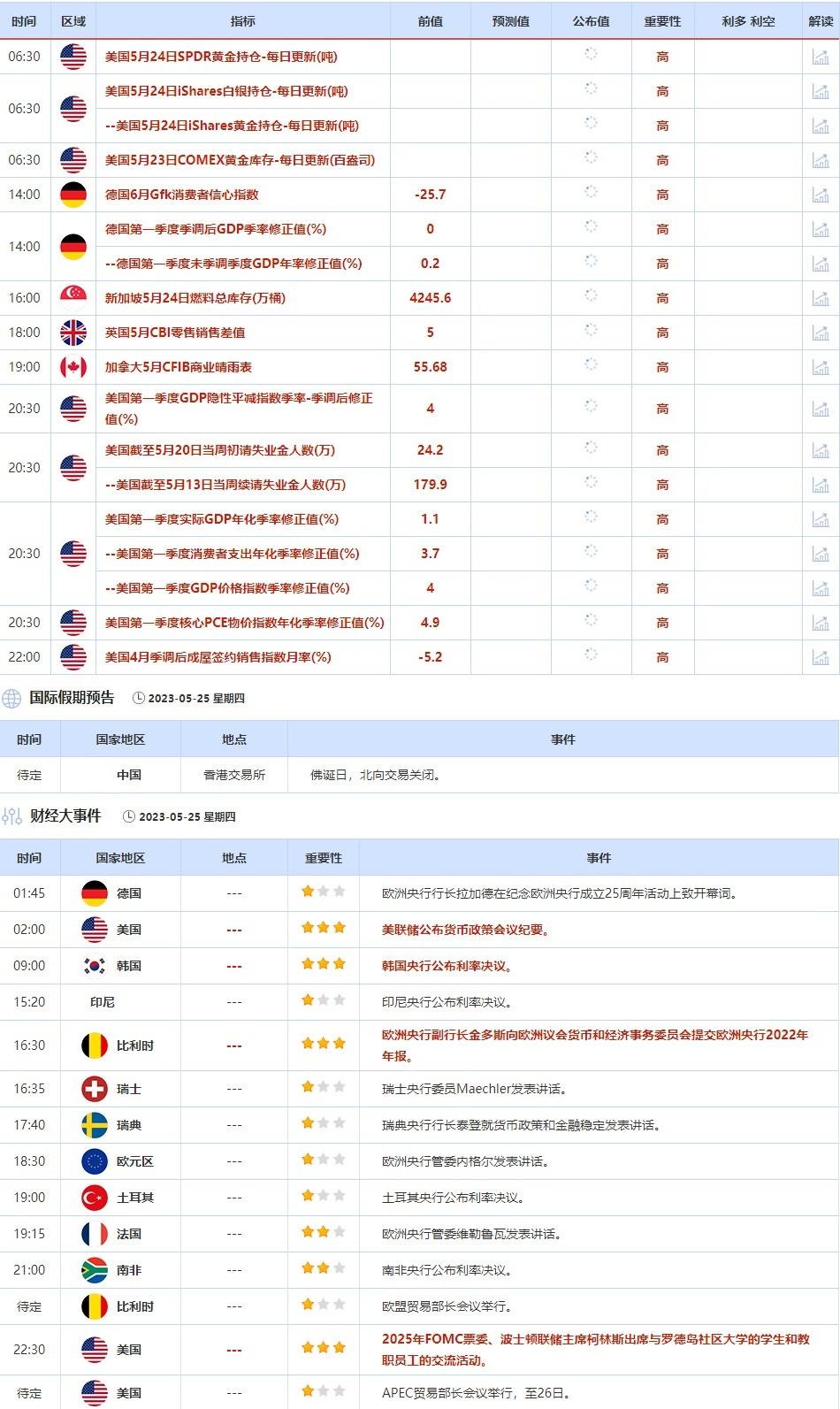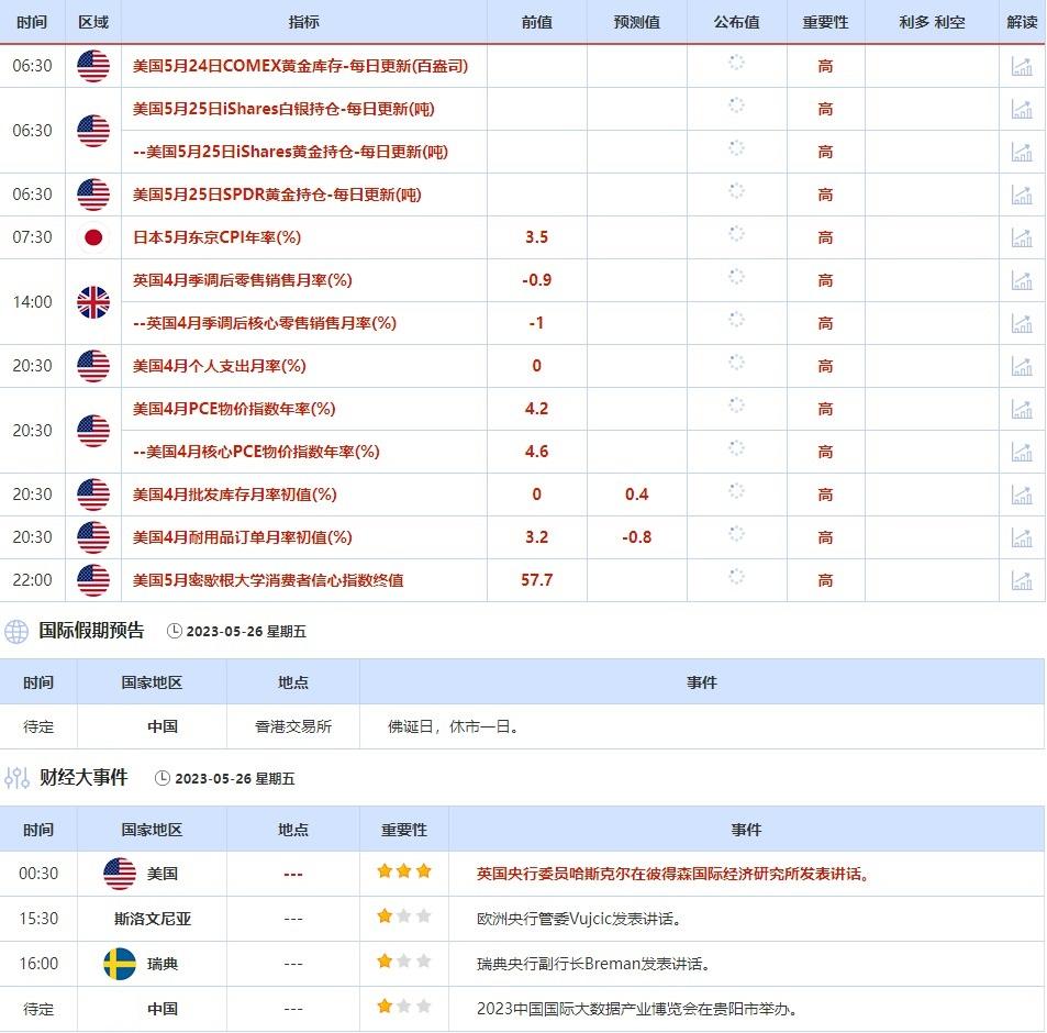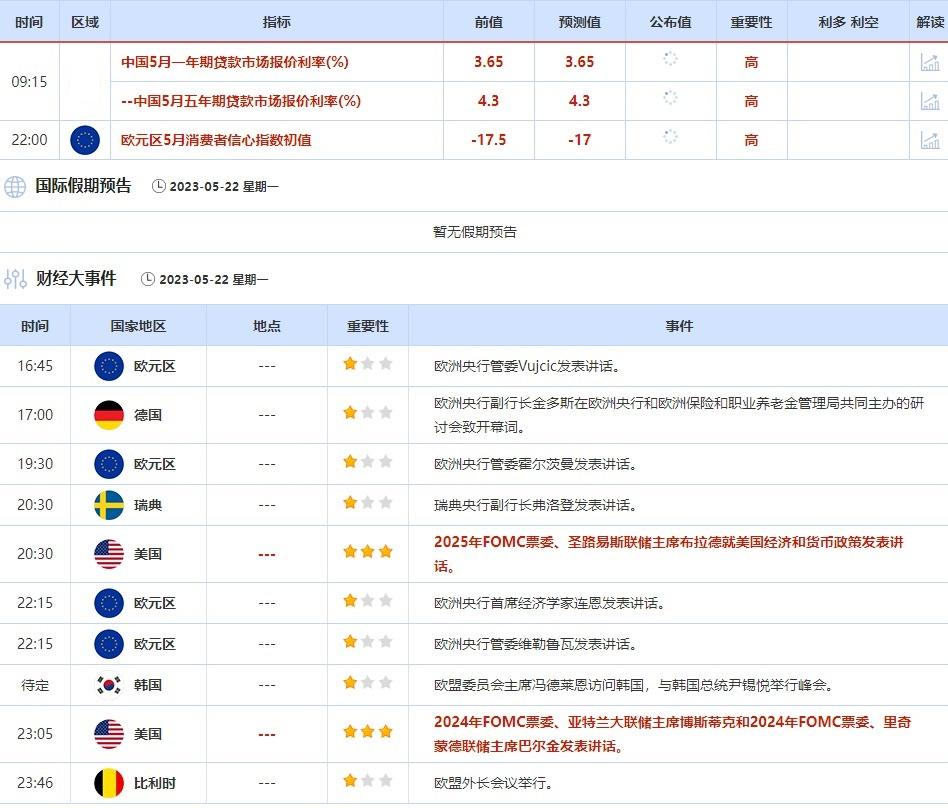 5月23日当天,欧洲央行副行长金多斯发表讲话,达拉斯联储主席洛根在里奇蒙德联储主办的研讨会上致欢迎辞,英国央行委员哈斯克尔发表讲话,投资者需关注他们的最新观点,或对市场走势产生影响。