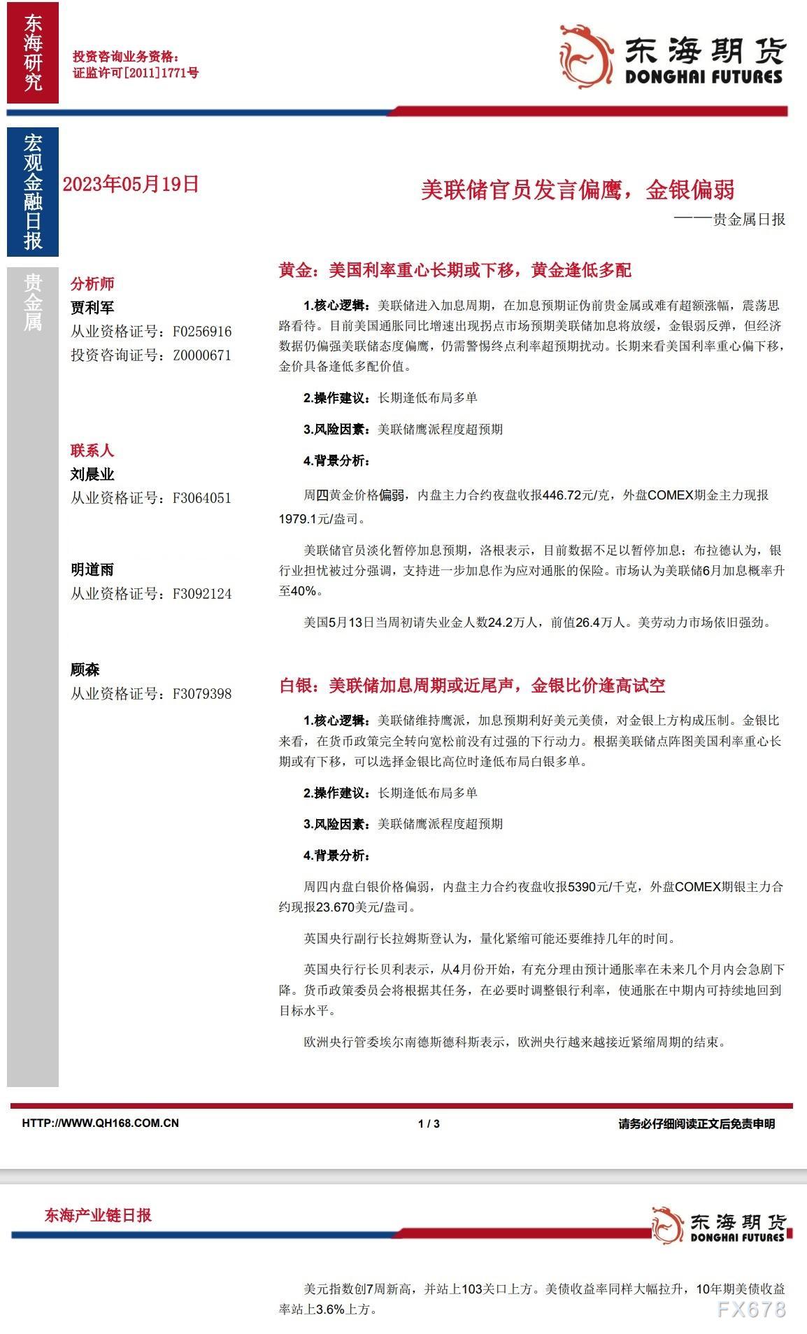 【东海期货5月19日产业链日报】贵金属篇:美联储官员发言偏鹰,金银偏弱