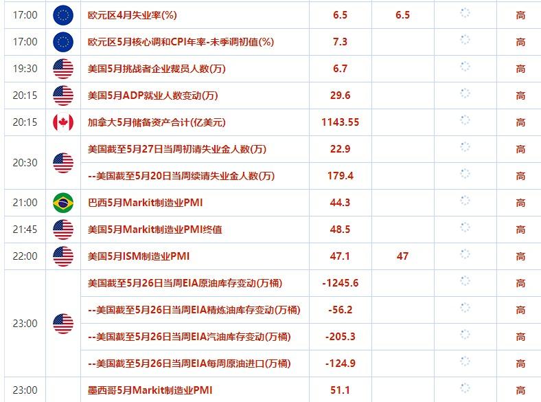6月2日,美国将公布5月非农和失业率,市场预期5月非农增加18万,低于25.3万的前值。市场预期美国5月失业率为3.5%,略高于3.4%的前值。
