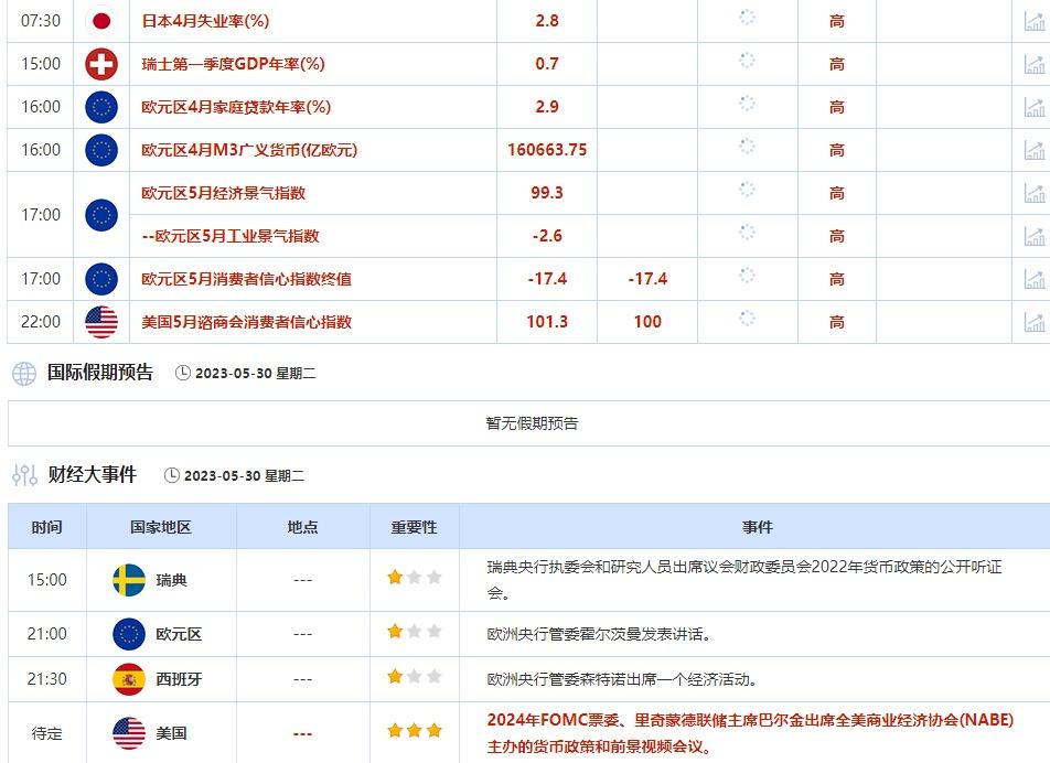 ②5月30日(周二)关键字:欧元区5月经济景气指数,里奇蒙德联储主席巴尔金