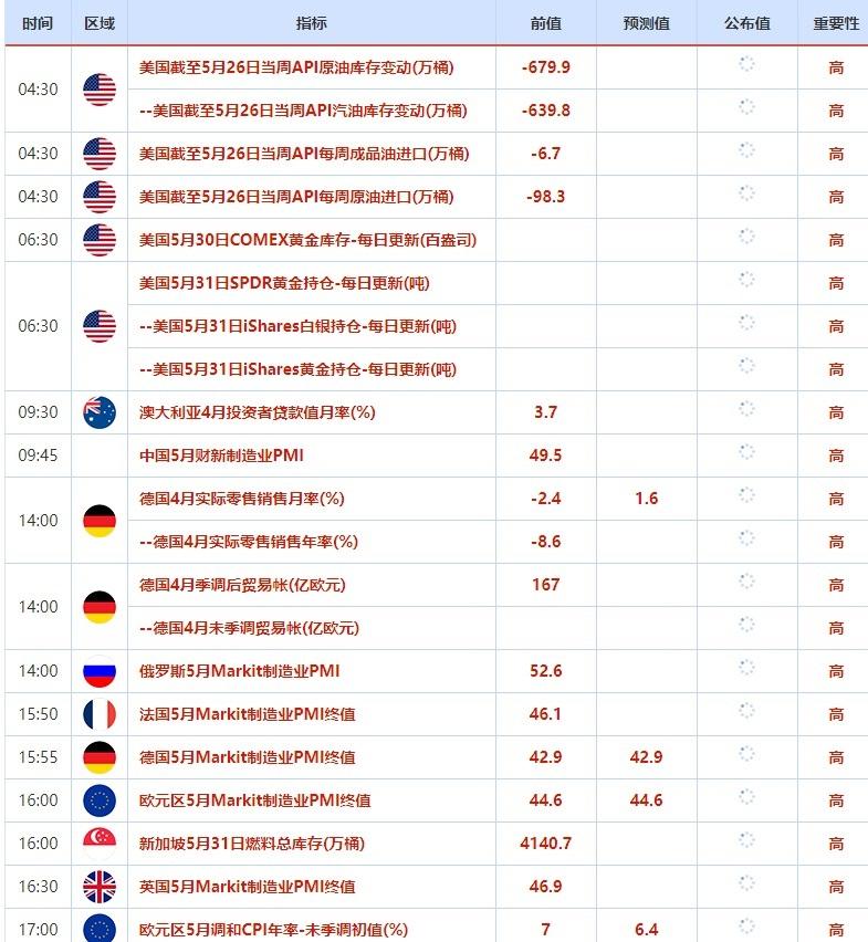 ④6月1日(周四)关键字:美国API和EIA原油库存变动,欧元区5月CPI,美国5月ADP就业人数变动,美国截至5月27日当周初请失业金人数 ,欧洲央行5月货币政策会议纪要